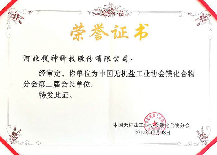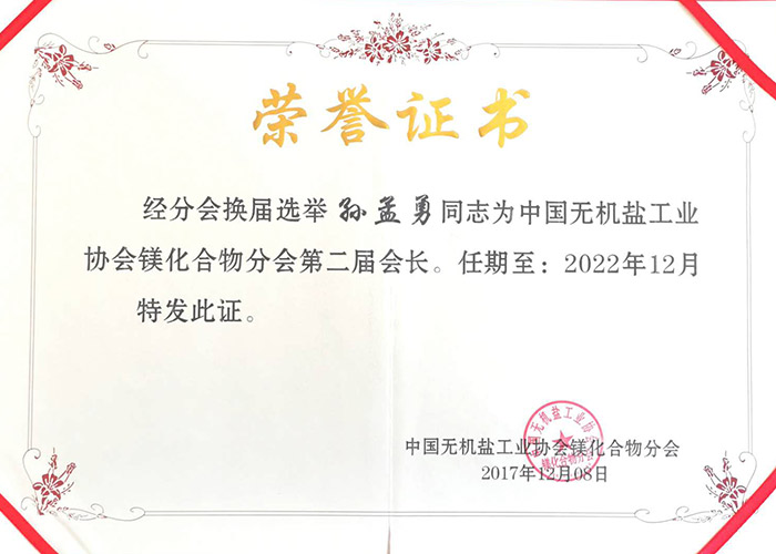 中國(guó)無(wú)機(jī)鹽工業(yè)協(xié)會(huì)鎂化合物分會(huì)第二屆分會(huì)會(huì)長(zhǎng)