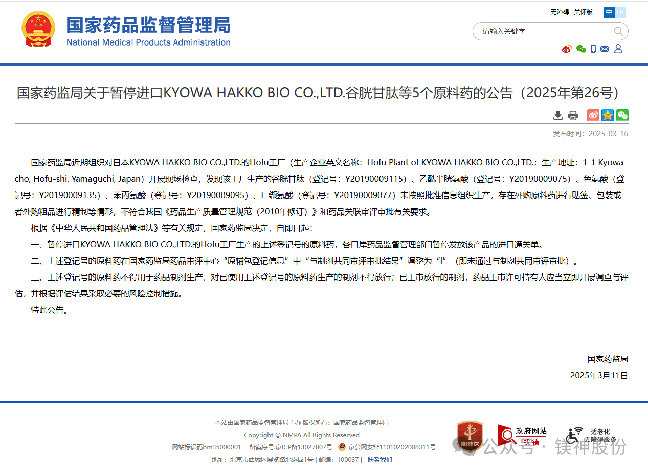 國(guó)家藥監(jiān)局暫停進(jìn)口日本KYOWA HAKKO BIO CO.,LTD.原料藥,國(guó)