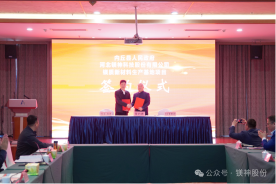 2025年3月28日,河北鎂神科技股份有限公司與內(nèi)丘縣人民政府在阿爾卡迪亞酒店悅盛廳隆重舉行鎂質(zhì)新材料生產(chǎn)基地項(xiàng)目簽約儀式。該項(xiàng)目總投資20.25億元,選址邢臺(tái)市內(nèi)丘縣工業(yè)園區(qū),致力打造世界級(jí)高端鎂質(zhì)新材料生產(chǎn)基地,為區(qū)域經(jīng)濟(jì)高質(zhì)量發(fā)展注入新動(dòng)能。